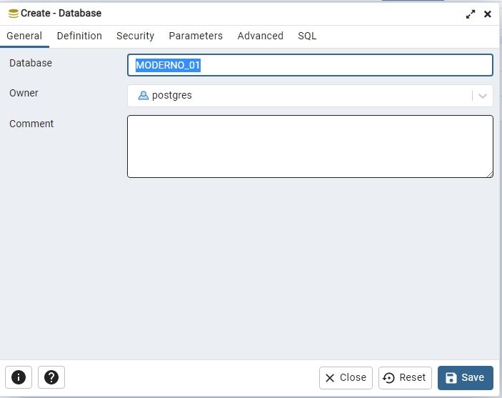 Como já tenho um banco de dados criado com o nome de MODERNO, Vou definir como "MODERNO_01", sem as aspas, tudo maiúsculo sempre.