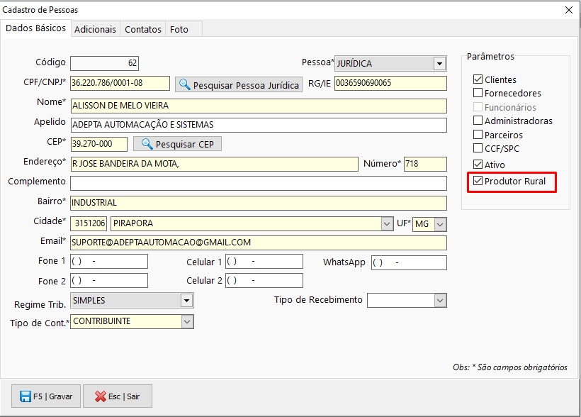Rotina: Sistema > Empresa > Parâmetros > Funrural Acesse a Aba Funrural na parte inferior do sistema, defina a Alíquota % Para Salvar o processo basta clicar em "Gravar"
