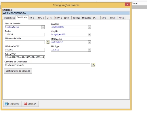 Apague o número de Série do Cerificado, defina o caminho do arquivo do Certificado, e, Cryptlib selecione cryOPenSSL, HttpLib selecione httpOpenSSL, e SSL Type selecione LT_all.
