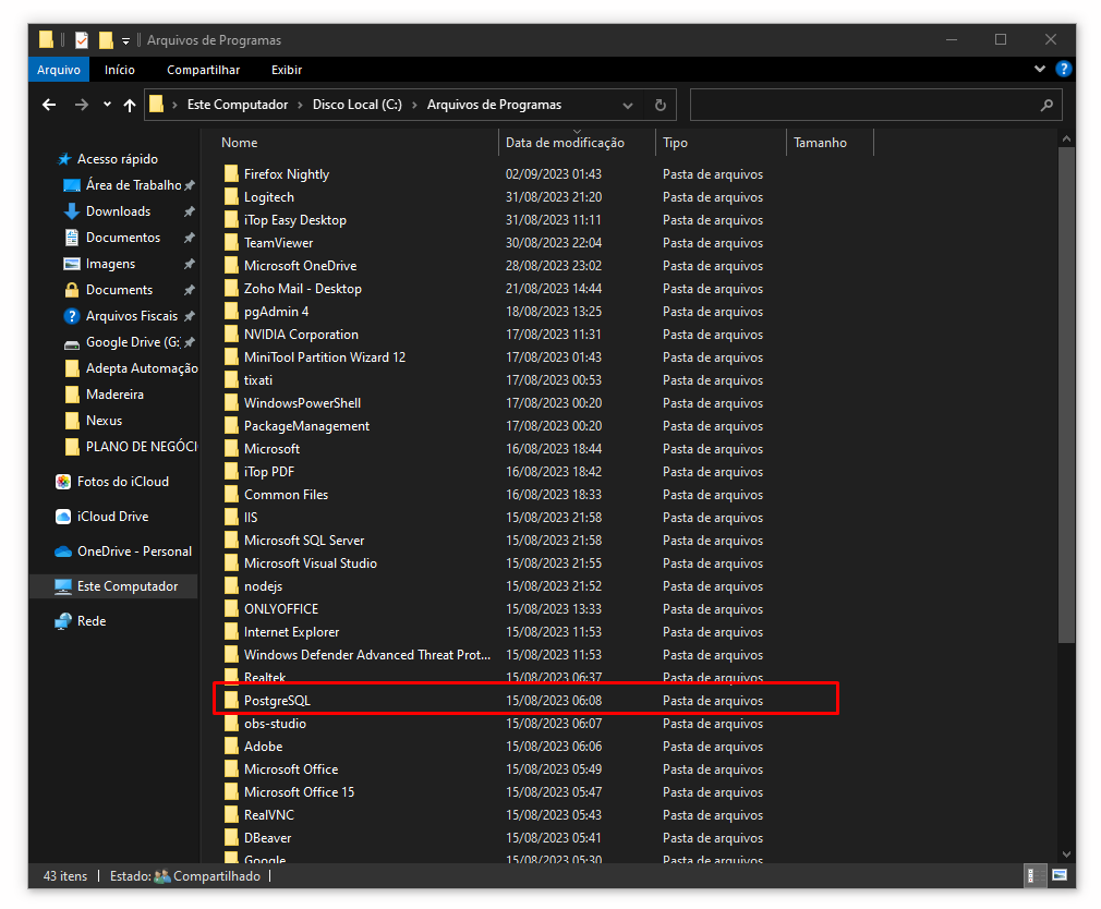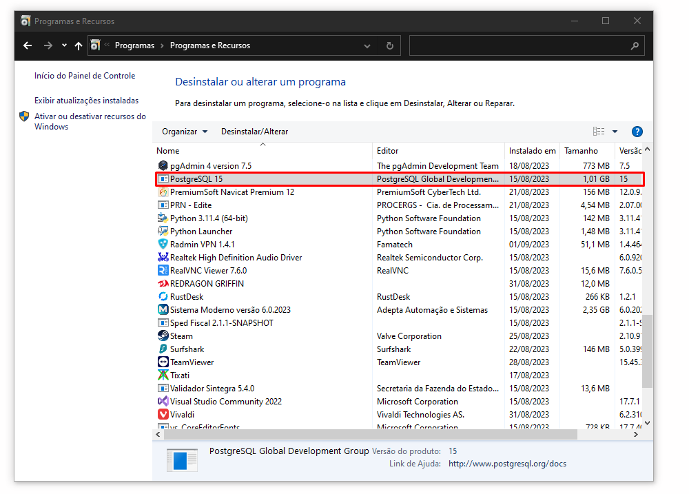 Desinstalação do PostgreSQL por falha.