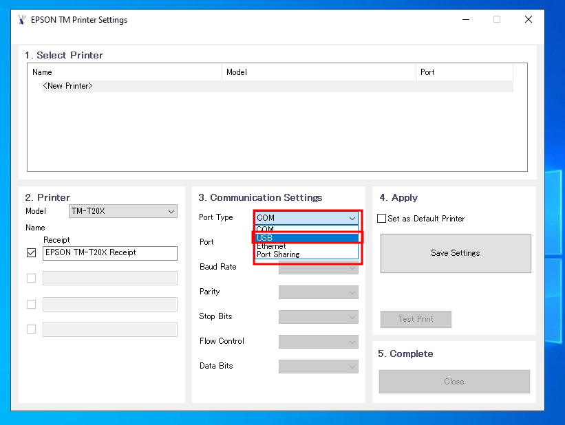 Na guia "Portas", selecione a porta USB correspondente à impressora e clique em "Aplicar" e em "OK".