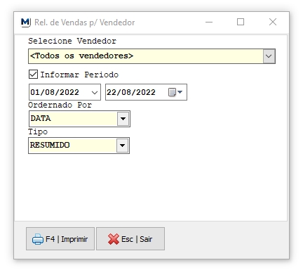 Geralmente usado para ver as vendas realizadas mensalmente ou diária; Filtro: Todos os Vendedores