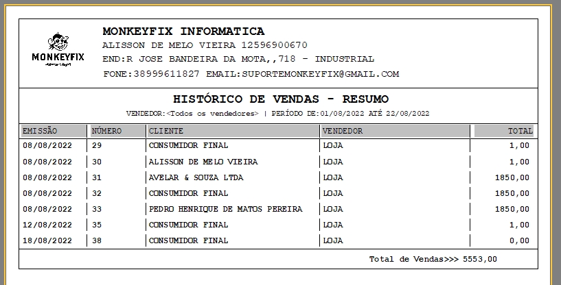 Resumido: Você terá um relatório Com Data, Número, Cliente, Vendedor e total.