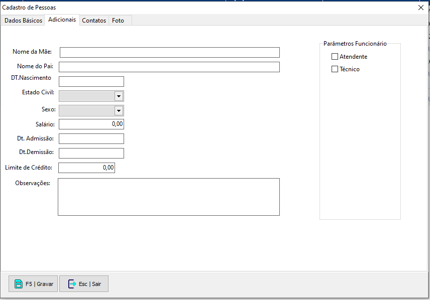 Para Definir um Atendente para Ordem de Serviço e Orçamento, ou técnico, ,arque as opções em "Parâmetros Funcionário"