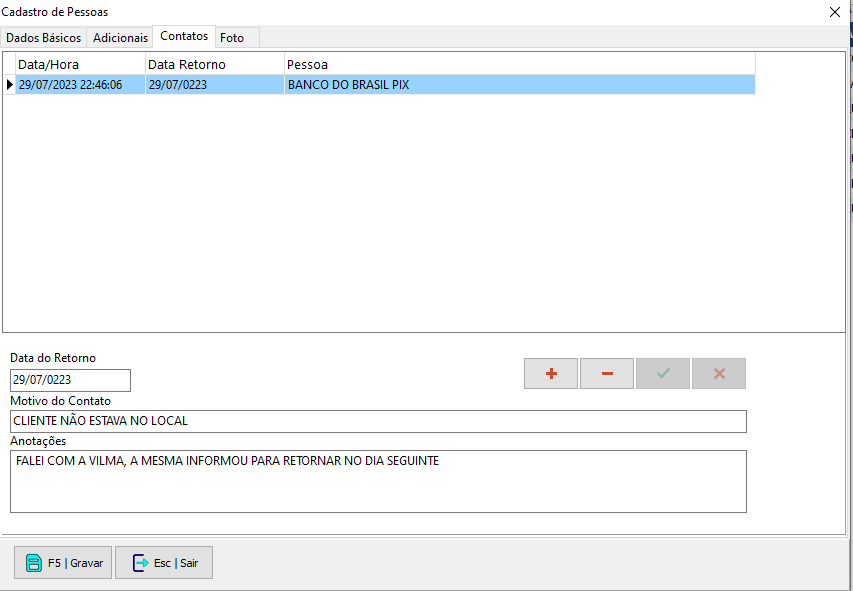 Preencha os campo abaixo, como data do retorno, Motivo do contato, e Anotação e Clique em + para Adicionar a informação no cadastro da pessoa.