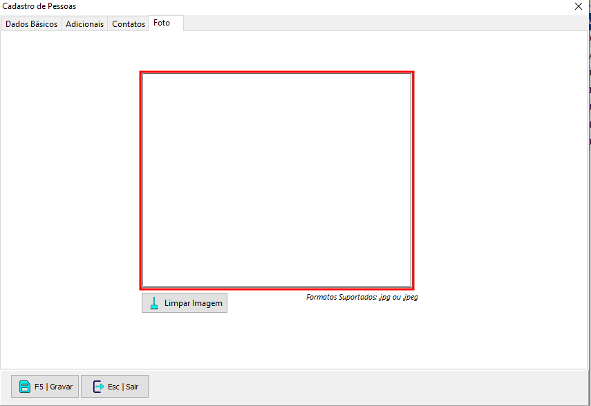 Na aba "Foto", você pode definir uma foto clicando no quadro branco no centro do formulário de cadastro; apenas formatos jpg e jpeg são suportados.