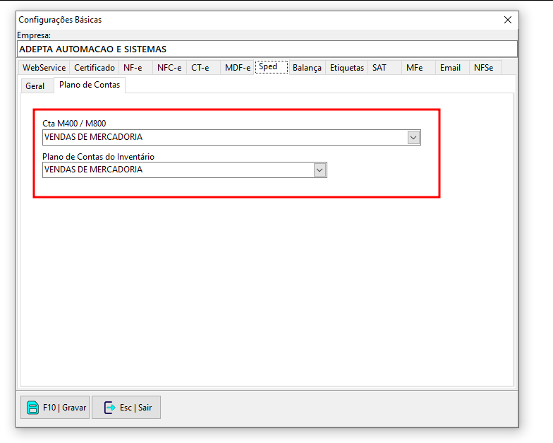 Agora na Aba > Plano de Contas, defina o CTA M400 / M800 e o "Plano de Contas do Inventário":