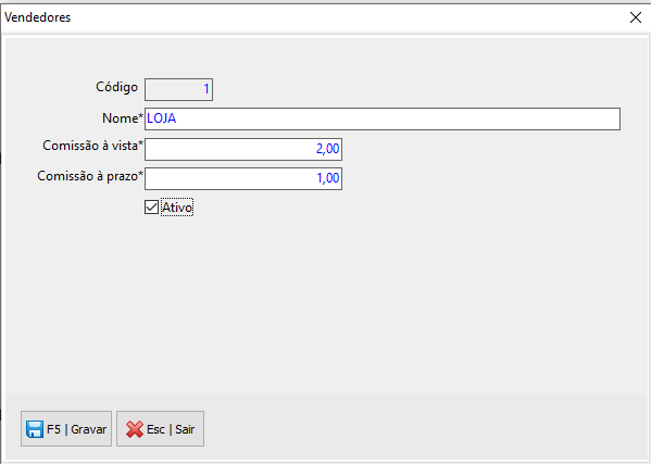 Em "Comissão à vista" e "Comissão à prazo", defina o valor recebido por cada venda em porcentagem;