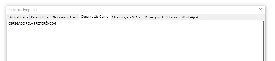 Na rotina de Sistema > Empresa > Alterar > Observação Carne, você pode definir a mensagem que será exibida nas balanças. Basta acessar a aba "Observação Carne" na parte superior do sistema e inserir o texto desejado no campo de mensagem. Essa informação será fixada em todas as balanças.