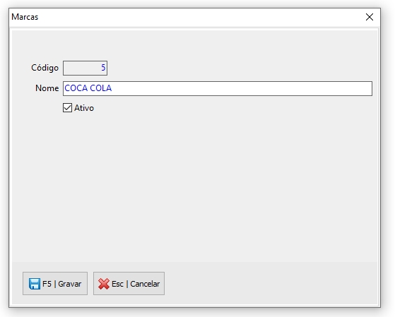 Crie um novo cadastro clicando no Botão "Novo"Coloque um nome para sua "Marca"Não esqueça de Marcar "Ativo".