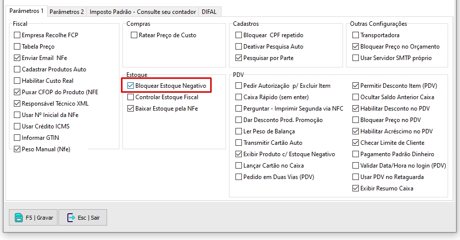 Marque a opção "Bloquear Estoque Negativo"