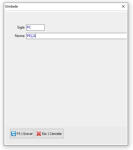 Rotina: Estoque > Unidades Crie um novo cadastro clicando no Botão "Novo" Defina uma Sigla de no máximo 3 dígitos, coloque o nome por extenso Para Salvar o processo basta clicar em "Gravar"