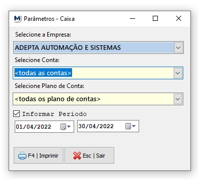 Rotina: Financeiro > Relatório de Movimento de Caixa