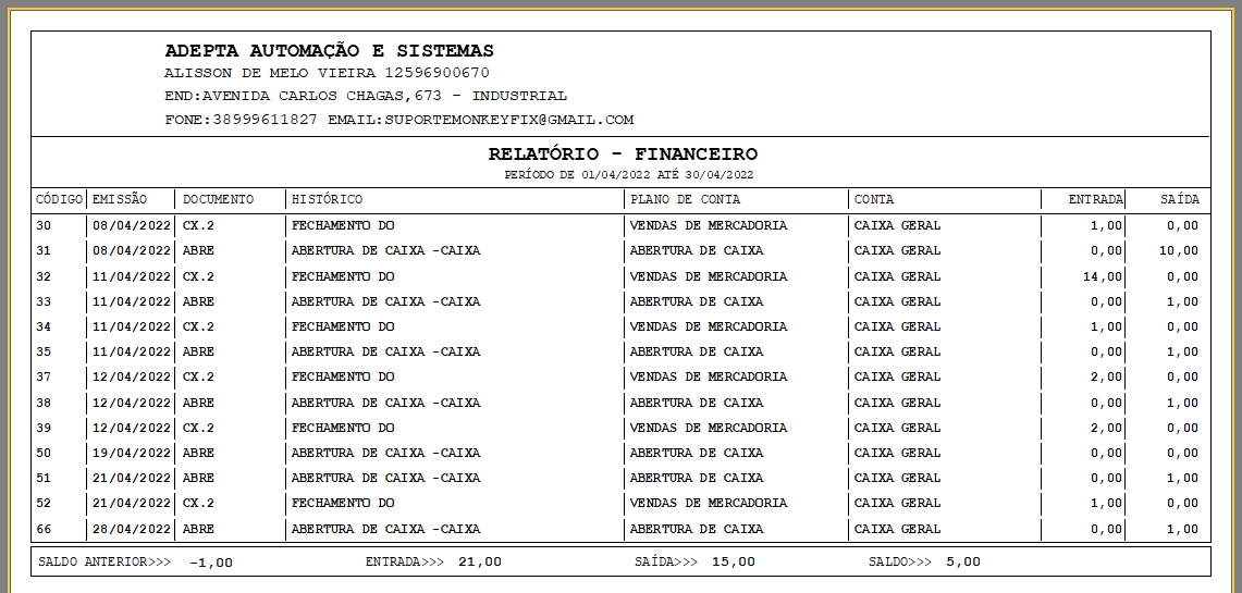 Esse relatório mostra todas as entradas e saídas do período por plano de contas, basta selecionar o caixa e o plano de contas que deseja e informar um período.