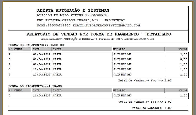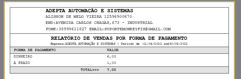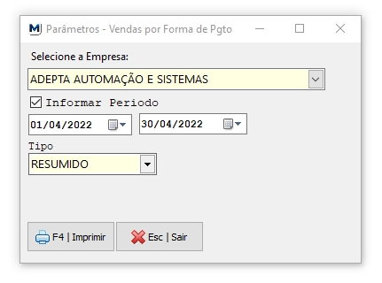 Rotina: Financeiro > Relatório de Vendas por forma de pagamento