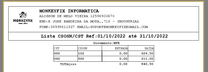 Para Visualizar o Relatório Clique em "F4 Imprimir"Visualização do Relatório, com CST, CSOSN, Entrada, Saída e total!