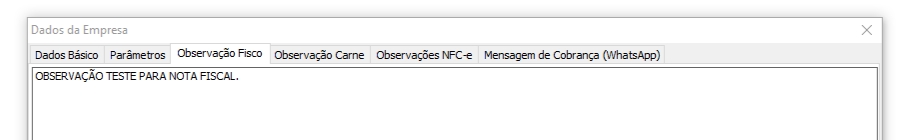 A rotina "Sistema > Empresa > Alterar > Observação Fisco" serve para adicionar informações adicionais que serão fixadas em todas as Notas Fiscais emitidas pelo sistema. Para fazer isso, é preciso acessar a aba "Observação Fisco" e definir a informação que será adicionada.