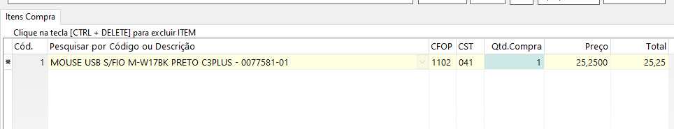 No campo inferior basta digitar o nome do produto cadastrado em estoque para adiciona-lo a nota