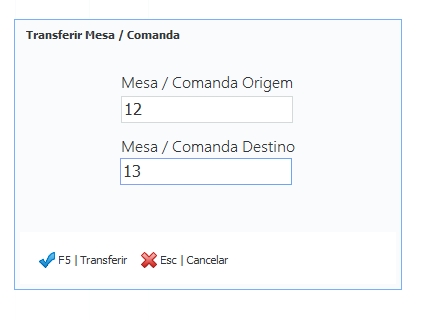 Para Realizar uma transferência de Mesa, utilize a tecla ctrl + B para transferir a mesa de Origem para o seu destino final, confirmando com a tecla F5 para finalizar a transferência.