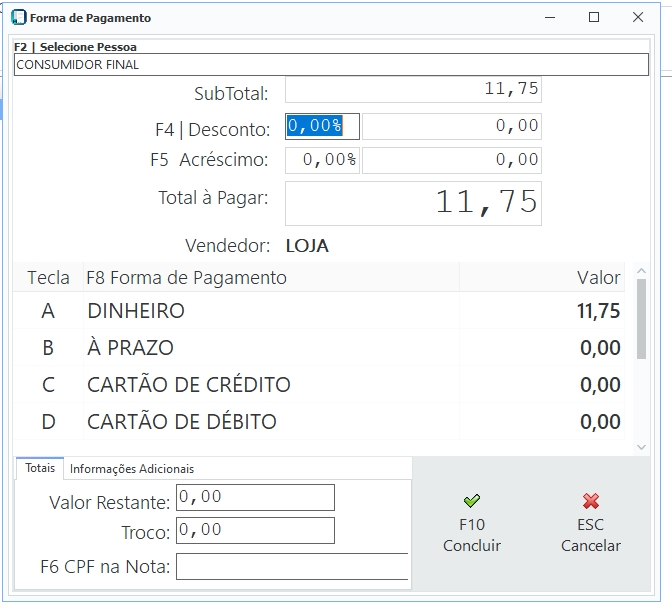 Clique sobre a mesa, e utilize a tecla F7 para finalizar a venda, informe a forma de pagamento, lembrando que basta zerar o valor de origem e digitar na forma de pagamento desejada; conclua usando a tecla F10.