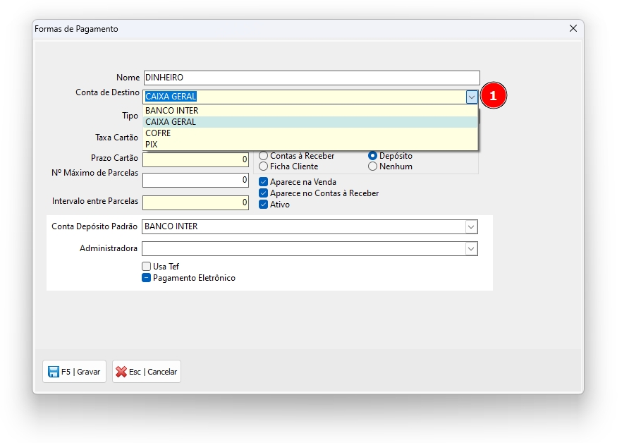 Em conta de destino selecione o caixa , isso define para onde vai as vendas das forma de pagamento selecionada