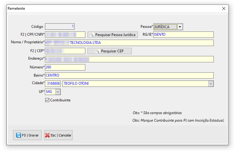 Em "Novo", vamos iniciar o cadastro de um novo Remetente