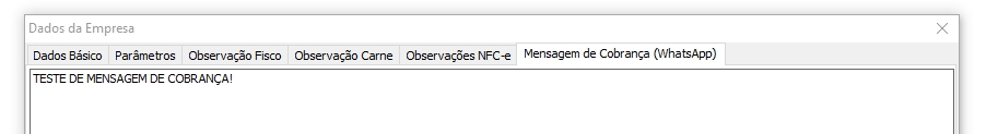 Esta rotina permite que uma mensagem de cobrança fixa seja configurada para ser enviada automaticamente via WhatsApp para os clientes. Para isso, é necessário acessar a opção "Sistema > Empresa > Alterar > Mensagem de Cobrança (Whatsapp)" no menu principal do sistema.